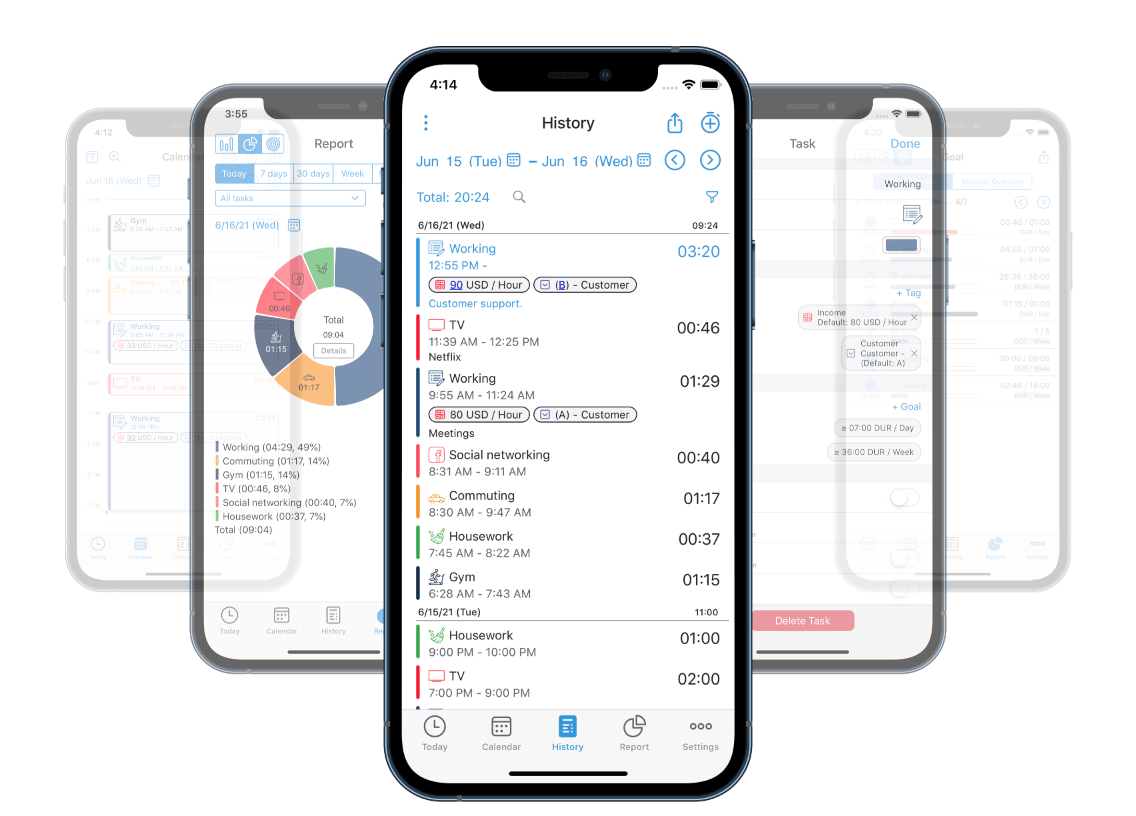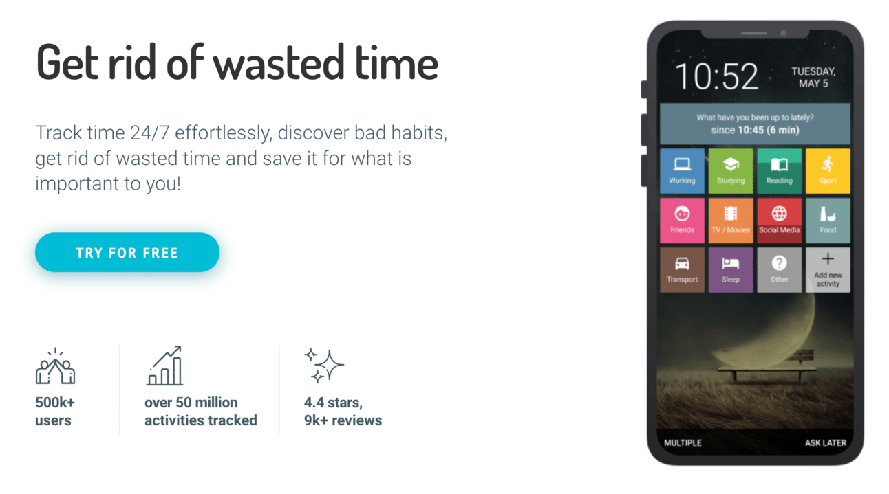 You track your time at the end of every activity. Open up the app when you’re done an activity and it’ll ask you what you’ve been up to since the last time you opened the app.