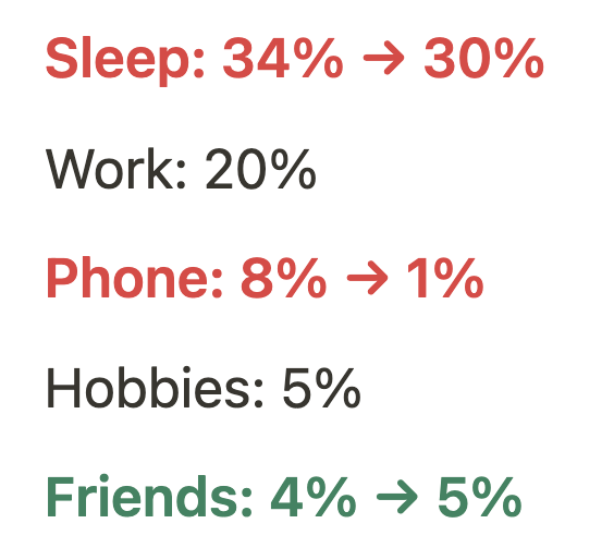 For example, if I want to exercise more, I’ll set my goal to increase time spent exercising from 1% to 3%. Then, at the end of every month, I see whether my habits are on track.